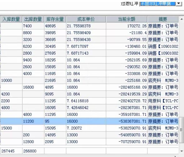 2、找到成本第一次出现异常的地方(成本单价很大、或者金额负数很大、或者库存余量出现负数的),记录下录单日期,例如:2019-05-01;
